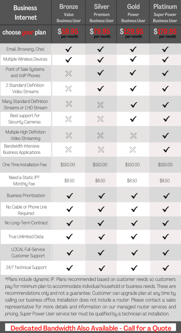 *Additional Installation Fees may apply for Dedicated Bandwidth Plans. Please call and speak with one of our Business Sales Associates for an appointment to get price quote.